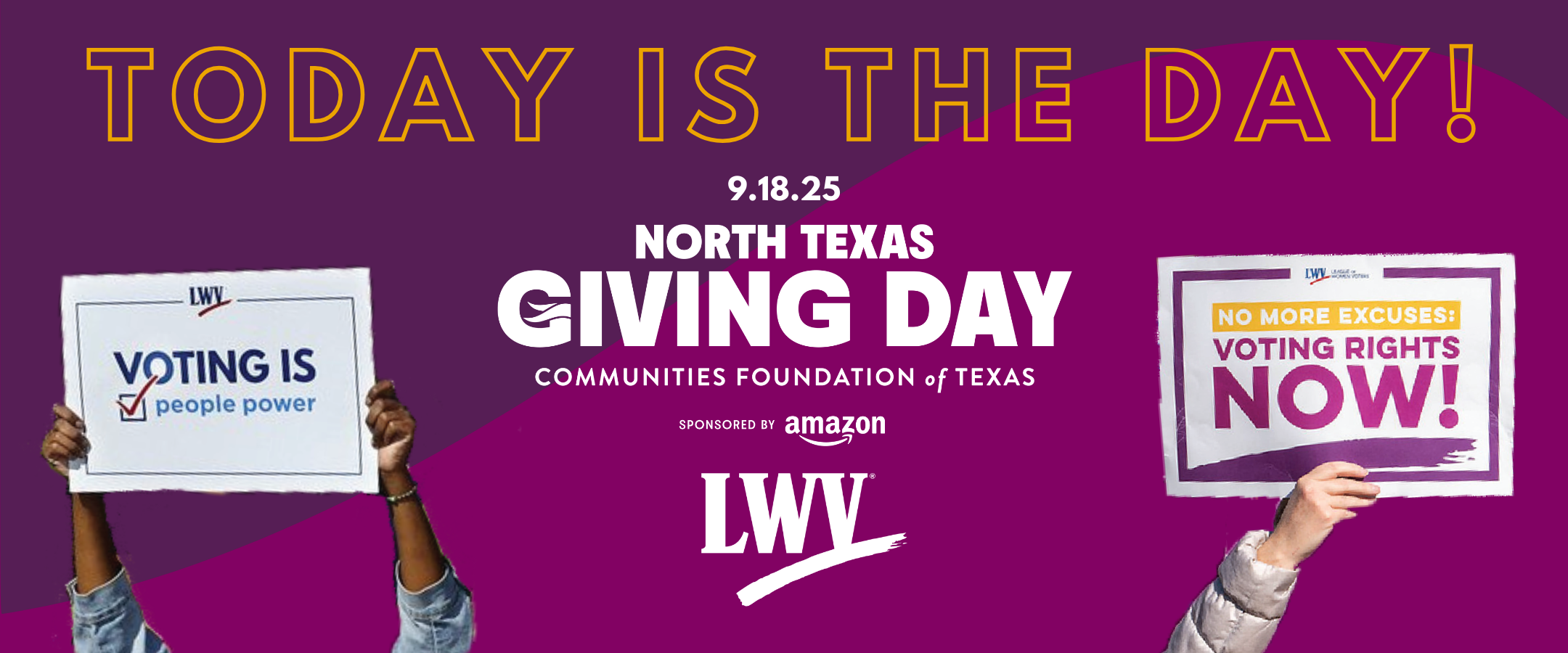 As a valued supporter of the League of Women Voters of Dallas, we are reaching out to kindly invite you to participate in our North Texas Giving Day fundraiser. Your contribution plays a crucial role in empowering voters, promoting civic engagement, and advocating for a more inclusive democracy in our community. Together, we can make a meaningful impact and ensure that every voice is heard. Your generosity and support are deeply appreciated. Thank you for joining us in this important mission.
