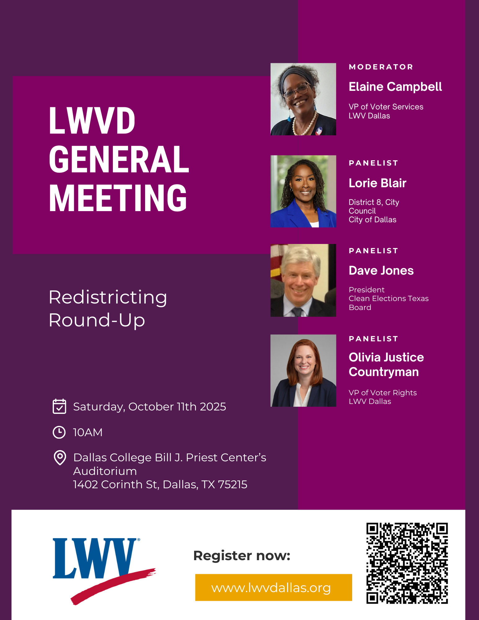 | Moderator: Elaine Campbell, LWVD VP of Voter Services