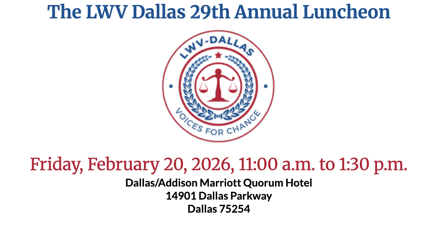 Dear League Members: You are invited to support the LWVD silent auction on Friday, February 20, 2026, at the Dallas/Addison Marriott Quorum Hotel. We will honor Dr. Levatta Levels, who will receive the Making Democracy Work Award, and Lynn McBee, who will receive the Eleanor Sutherland Volunteer Award.