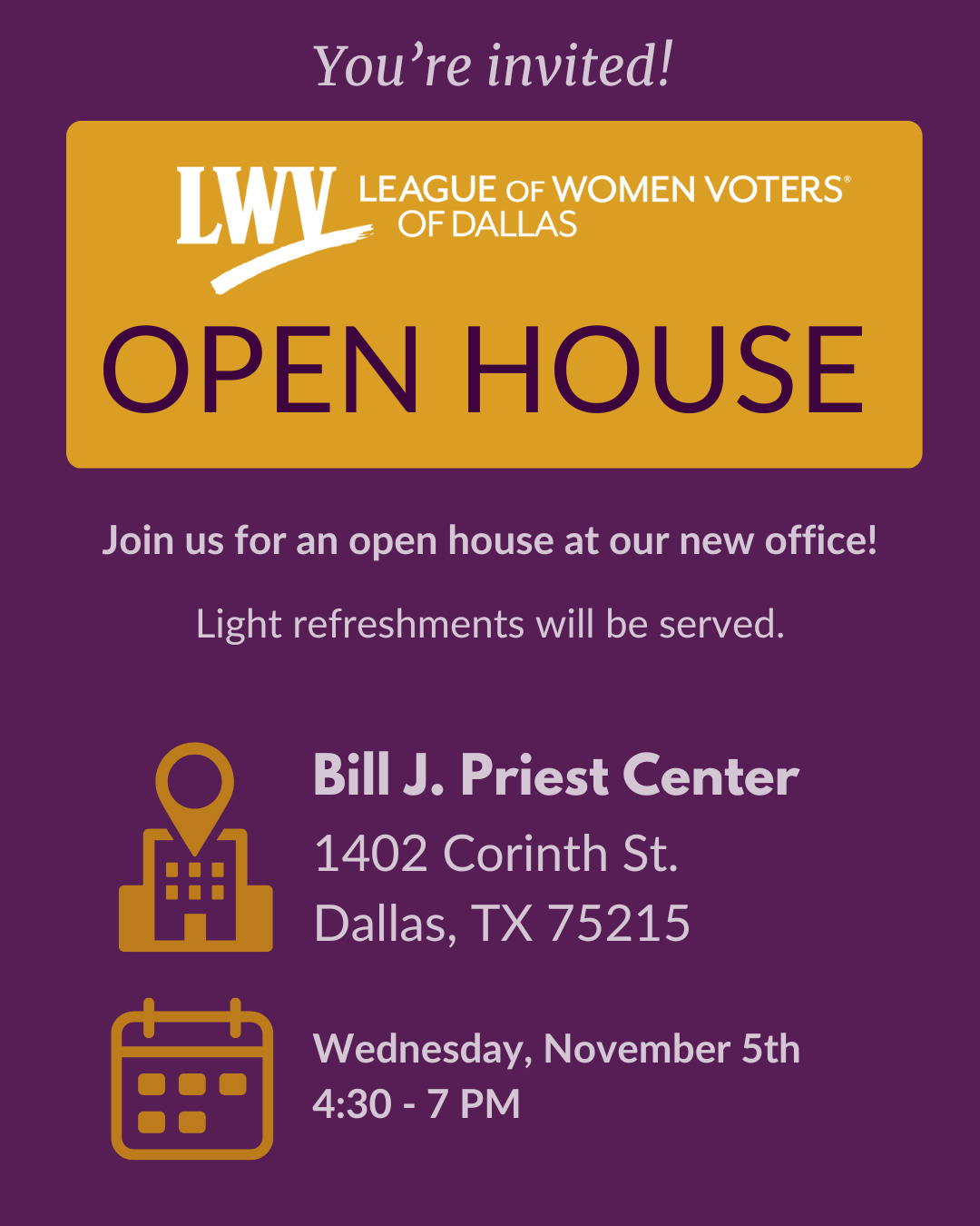 | Join us on Wednesday, November 5th, from 4:30 - 7 PM, for an Open House at our new office! We are now located in the Bill J. Priest Center, 1402 Corinth St, Dallas TX 75215. Volunteers will be at the entrances to help you find our meeting space.