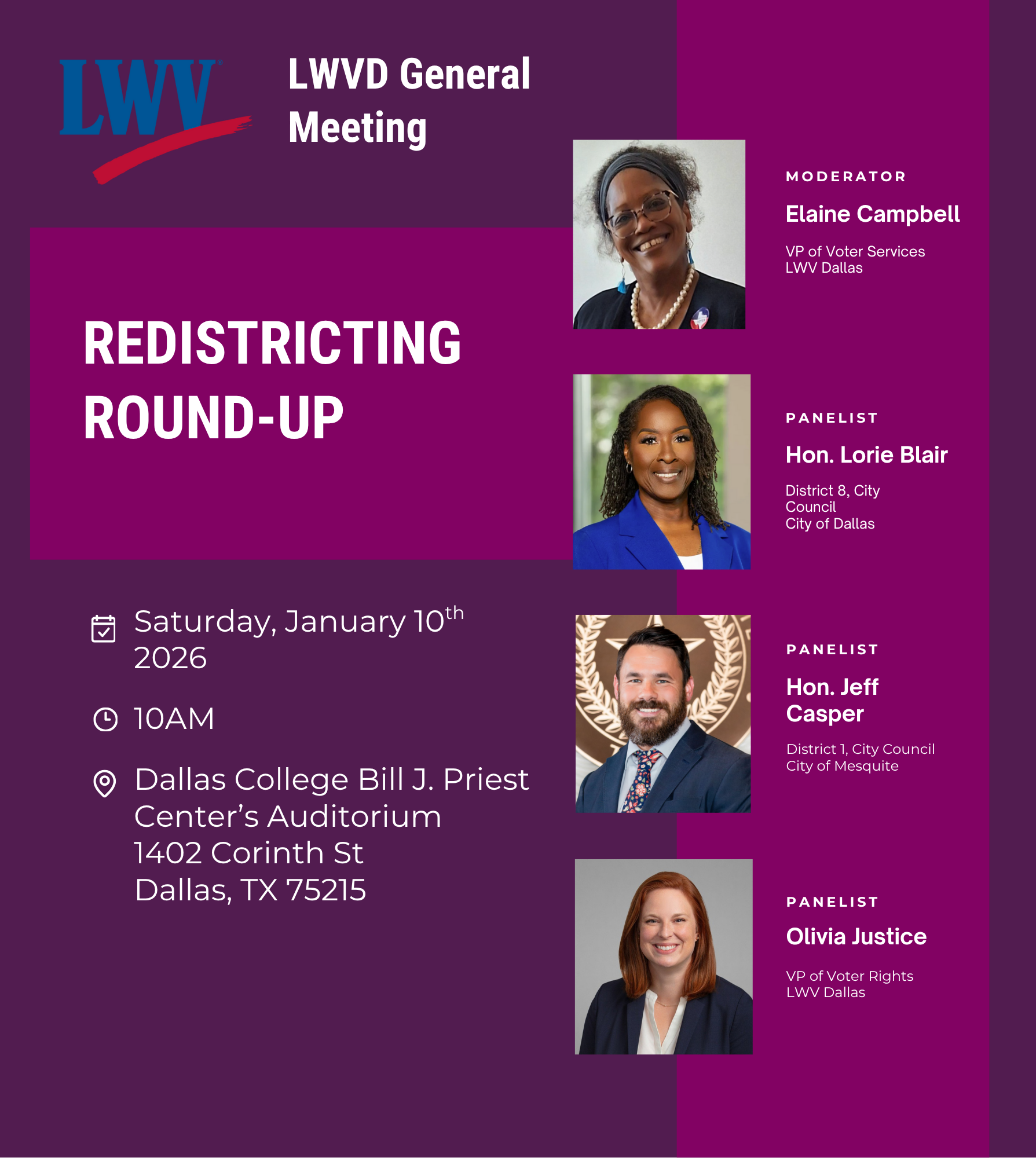 Join us on Saturday January 10, 2026, from 10am to 12noon for our January General Meeting, featuring esteemed panelists discussing Redistricting Roundup. Please register here!