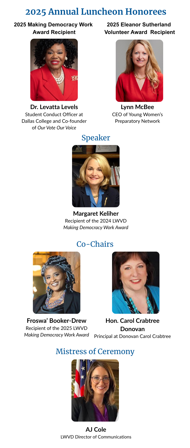 Dear League Members: You are invited to support the LWVD silent auction on Friday, February 20, 2026, at the Dallas/Addison Marriott Quorum Hotel. We will honor Dr. Levatta Levels, who will receive the Making Democracy Work Award, and Lynn McBee, who will receive the Eleanor Sutherland Volunteer Award.