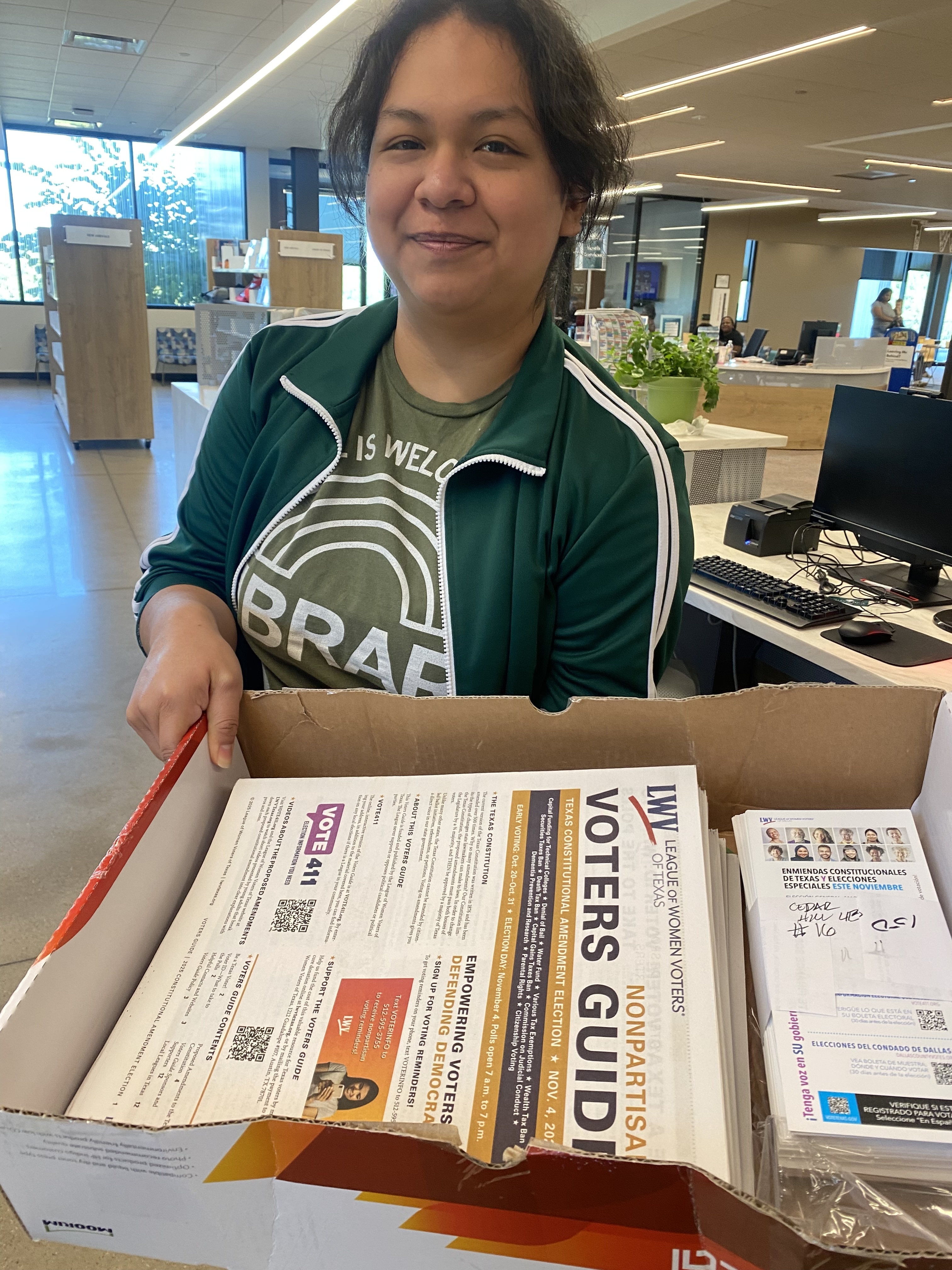 Image: A Cedar Hill Library employee receiving Voters Guides.